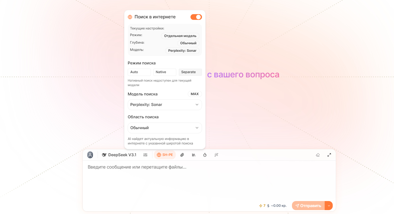 Например, вы спрашиваете о чём-то свежем, что только что произошло в мире. Ни одна базовая модель не знает новостей сегодняшнего дня. Тогда вы сможете использовать связку "репортёр + аналитик". На роль репортёра он зовёт Perplexity Sonar, который мчится в интернет и приносит самые свежие факты, новости и ссылки. А когда факты собраны, он передаёт их DeepSeek — умному аналитику, который изучает найденное, отсеивает лишнее и пишет связный, подкреплённый источниками ответ. Так рождается знание, а не догадки. Эта связка не особо тратит нейроны, а