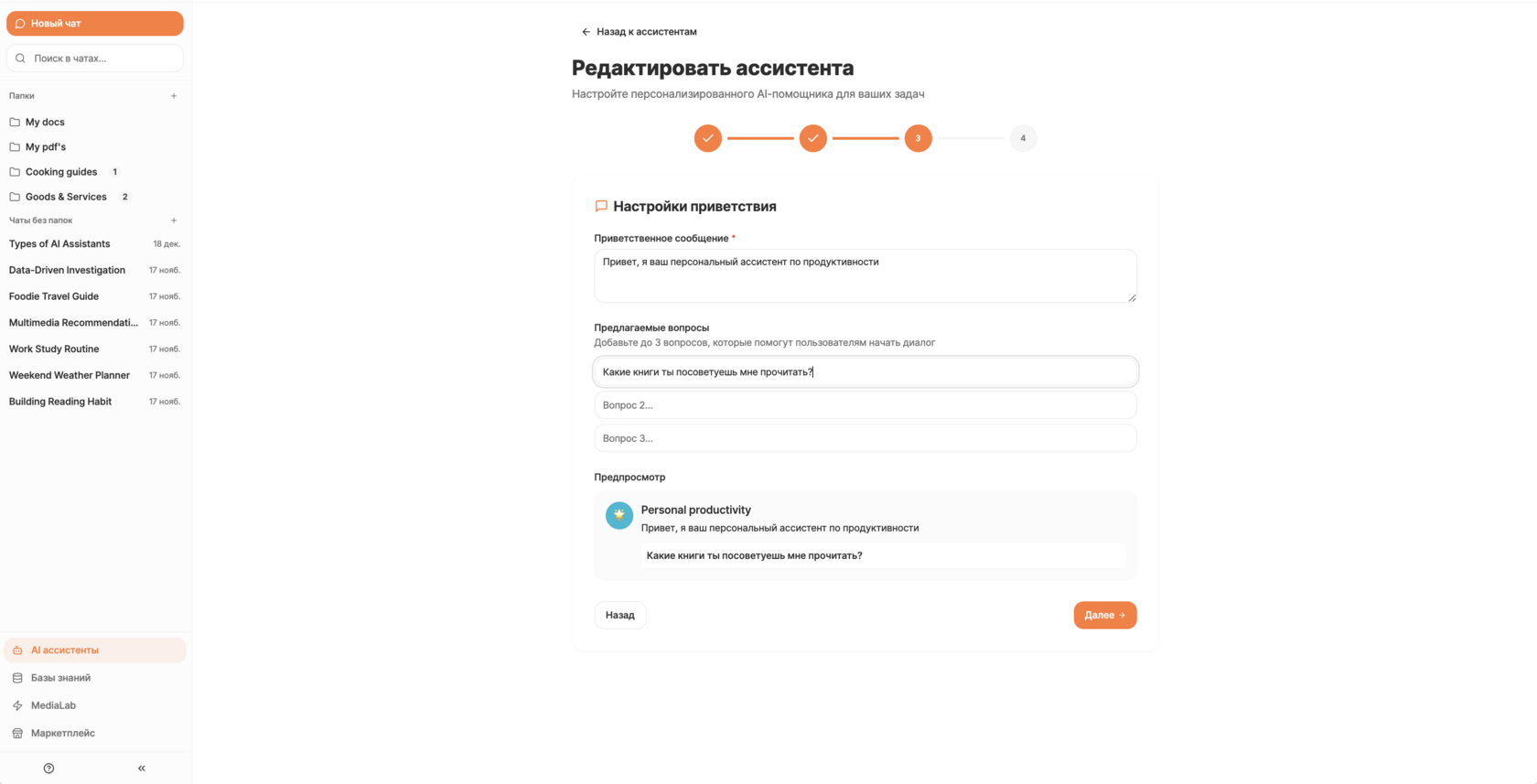 - Предлагаемые Вопросы: Это крайне полезная функция, особенно если ассистент предназначен для решения специфических задач. Задайте несколько типовых вопросов, которые помогут пользователю начать диалог и понять, как правильно формулировать запросы.
