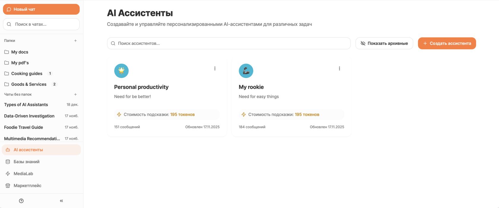 Именно здесь формируется ваш арсенал цифровых помощников, и каждый новый проект начинается с кнопки "Создать ассистента".