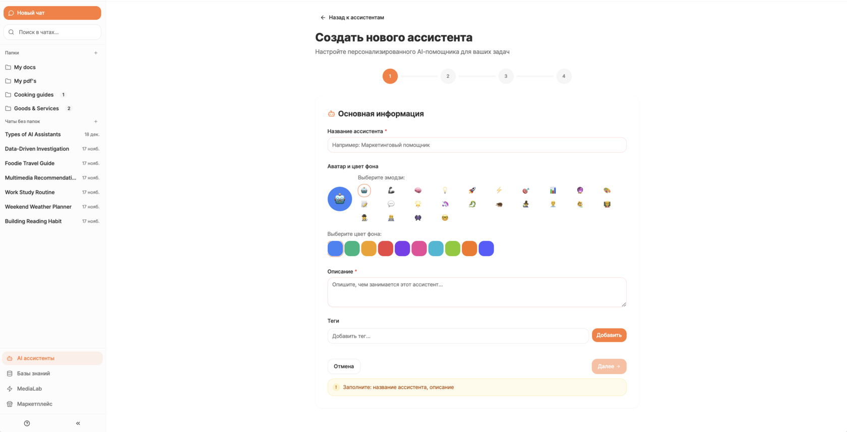 После нажатия кнопки "Создать ассистента" перед вами откроется панель настроек. На первом этапе необходимо заложить основу идентификации вашего будущего помощника: